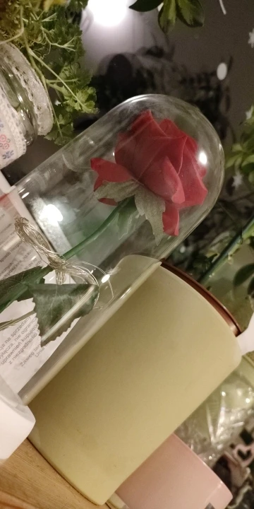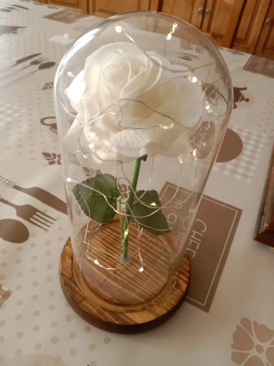 Materials: High-borosilicate glass dome, wooden base, silk rose